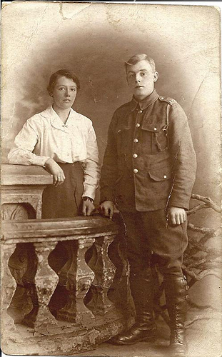 Picture 1 is of my mother outside Quievy cemetery annex. 2 is headsone of my great uncle William Hoare. 3 + 4 is of the farmhouse used as a field hospital where William died of his wounds. 5,6 +7 is of the river Selle north of where battle started and the spot where we believe William was shot and fatally wounded whilst watering his horse. 8, William and his sister Florence May Astill nee Hoare(Mother's mother,) 9 William ready to go to war. John.