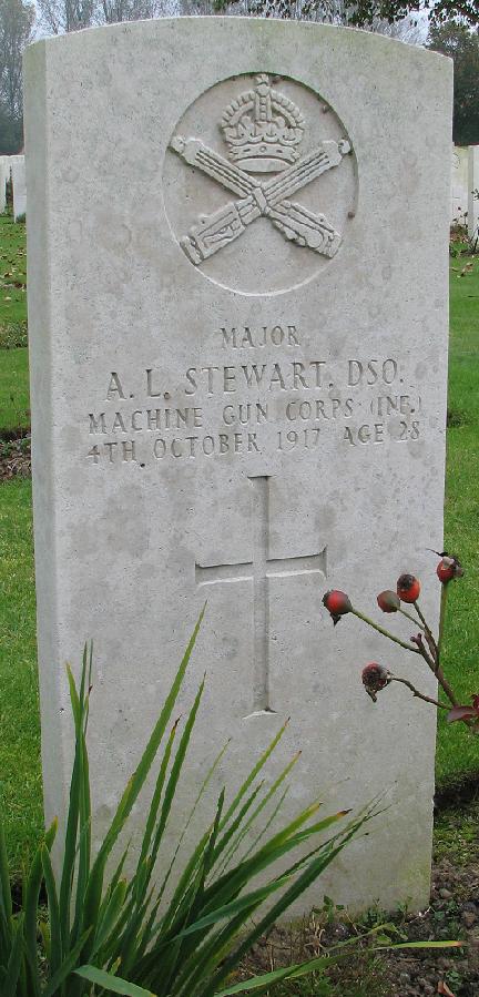 In Memory of Major ALBERT LEWIS STEWART D S O 22nd Bn., Machine Gun Corps (Infantry) who died age 28 on 04 October 1917 Son of Mrs Stewart of 101 Wellesley Avenue, Belfast; and the late James Stewart (Solicitor). Remembered with honour HOOGE CRATER CEMETERY