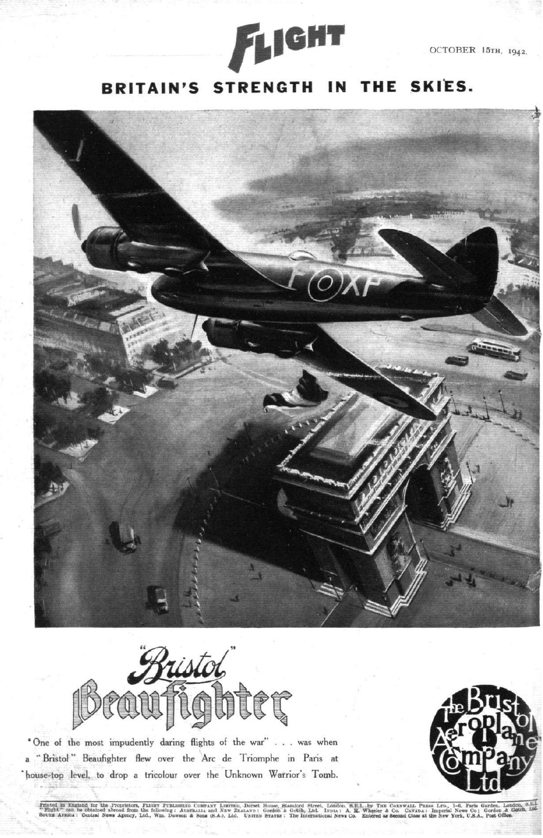 Operation ‘Squabble’ This was a special operation in the Paris area carried out in June 1942 which was intended to create a heartening effect among the Parisians and to expose the occupying Germans to ridicule. From information obtained from a reliable source it appeared that the enemy performed a routine parade along the Avenue des Champs Elysee every day between the hours of 1215 and 1245, and it was considered by the Air Ministry that a low flying machine gun and cannon attack launched against this parade would have most valuable results in upholding the moral of the French people. As the target was outside the range of Spitfires and all Fighter Command’s Beaufighters were fitted with special equipment, it was decided by the Air Ministry on 30 April 1942 that the operation should be undertaken by a Coastal Command Beaufighter Accordingly the A.O.C-in-C was requested to make arrangements for this attack to be delivered at his discretion. This special flight was allocated the name “Operation Squabble” and No. 236 Squadron was chosen to fulfil the task. The hazardous nature of this operation called for specific conditions of cloud cover over certain parts of the route which did not materialise until 12 June 1942, after four previous attempts had been made abortive by the lack of cloud cover on crossing the French coast. On this day, however, conditions appeared to be more satisfactory, so, Beaufighter C/236 Squadron with F/Lt. A K. Gatward as pilot and Sgt. G F. Fern as navigator, was airborne at 1129 hours from Thorney Island on “Operation Squabble”. In conditions of ten tenths cloud at 2,000 feet with heavy precipitation the aircraft set course for the target at 1131 hours. Crossing the French coast a few miles eastward of Fecamp at 1158 hours, the cloud began to thin out and by the time Rouen was reached there was bright sunshine. With visibility at ten to twenty miles and no cloud, the aircraft passed over the suburbs of Paris at a very low altitude and some light flak was encountered for the first time. The Eiffel Tower was easily pinpointed and was circled at 1227 hours. There was, unfortunately, no sign of the parade, but to compensate for this development a Tricolour was successfully dropped over the Arc de Triomphe, after which the aircraft flew down between the buildings of the Champs Elysee but there was still no sign of any troops. In accordance with briefing instructions the pilot then proceeded to attack with cannon fire the Ministry of Marine building and released a second Tricolour. The pilot reported that there were plenty of people about of both sexes, with most of them in shirt sleeves, many of whom waved. Before opening fire on the Ministry of Marine building, however, the pilot ensured that there were no pedestrians in the line of fire. His point of aim was half-way up the building. At 1230 hours the aircraft set course for base and maintained the same track back to the coast as followed on the outward flight. The French coat was crossed for the second time at 1255 hours and the aircraft finally landed at Northolt at 1353 hours. The whole sortie had been flown at a height of twenty to thirty feet and although the aircraft flew over Rouen aerodrome at this altitude no enemy opposition was encountered. The light flak encountered over the target was very poor. This mission received its full share of publicity and some of the photographs en route were released to the general public. In addition, the pilot of the aircraft, F/Lt. A K. Gatward was awarded the DFC and the navigator Sgt. G F. Fern was granted a commission. AIR 41/47