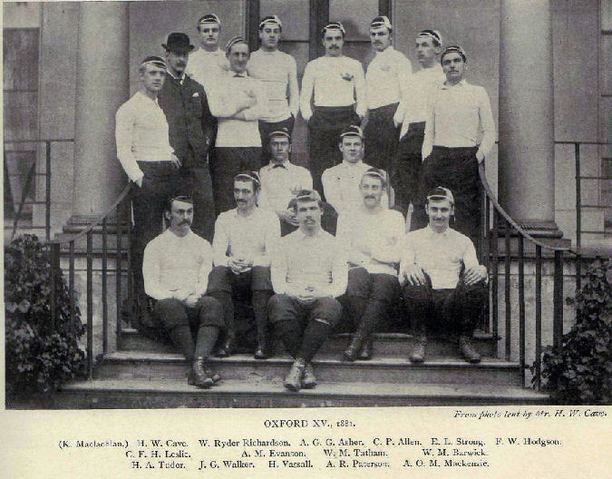 Blues Register:- ALLEN, Charles Peter Born 1861. Educated at Rugby and University College, Oxford. Played in Oxford Fifteen 1881, 1882, 1883; International Rugby, Wales v. England 1884, obtaining first try ever scored by Wales v. England, against Scotland 1884. Barrister, newspaper proprietor, M.P. (Liberal) for Mid-Gloucester from 1900, Charity Commissioner. Privy Council 1912. Address: Farmhill Park, Stroud, Gloucestershire. Picture is the Oxford XV 1881, Allen is 3rd from right in the standing rear row. Andy