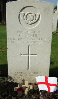 In Memory of Serjeant COLIN (CHARLIE) BLYTHE 49296, 12th Bn., King's Own Yorkshire Light Infantry who died age 38 on 08 November 1917 Son of Mr. and Mrs. W. Blythe, of New Cross, London; husband of Janette Gertrude Blythe, of 1, Vale Royal, Tunbridge Wells, Kent. Professional Cricketer. Played for Kent between 1899 and 1914 during which time he took 100 wickets each season, bar two. He also played in 19 Test Matches for England. Remembered with honour OXFORD ROAD CEMETERY Colin Blythe (born May 30, 1879 in Deptford; died in World War I on the Forest Hall to Pimmern military railway line, Belgium on November 8, 1917), also known as Charlie Blythe, was a Kent and England left arm spinner who is regarded as one of the finest bowlers of the period between 1900 and 1914 - sometimes referred to as the "Golden Age" of cricket. Regarded as a sensitive and artistic person, and a talented violinist, Blythe suffered from epilepsy yet enlisted as a soldier in the British Army when the war broke out in 1914. He soon announced he would be playing no more first-class cricket. Blythe joined the King's Own (Yorkshire Light Infantry). Sergeant Blythe was serving with the 12th (S) Battalion when he was killed by random shell-fire on the railway between Pimmern and Forest Hall near Passchendaele on 8 November 1917. Blythe is buried at Oxford Road Cemetery in Belgium http://www.national-army-museum.ac.uk/exhibitions/cricket/page3.shtml http://www.cricketarchive.co.uk/Archive/Pictures/1/1618.html