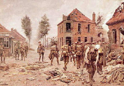 Pvt. Henry Tandey, VC at Marcoing September 28, 1918 Private Henry Tandey - Soldier of the 5th Duke of Wellington Regiment. ..... once had a wounded German in his line of sight ........... that Gefreiter (Lance Corporal) was Adolf Hitler ......... resigned - Adolf Hitler didn't aim his Rifle - he just stared at Tandey But Tandey could not shot a wounded man and he let him go ........ The annals of history are full of fateful moments which scholars refer to as the great "what if's" of history, where if events had taken only a slight deviation the course of human affairs would have been dramatically different. Such a moment occurred in the last moments of the Great War in the French village of Marcoing involving 27 year old Private Henry Tandey of Warwickshire, UK, and 29 year old Lance Corporal Adolf Hitler of Braunau, Austria. Henry Tandey was born in Leamington, Warwickshire, on the 30th August 1891, son of former soldier James Tandey. After a difficult childhood, part of which was spent in an orphanage, he became a boiler attendant at a hotel in Leamington before enlisting in the British Army, joining the Green Howards Regiment in August 1910 and embarking on a 'Boys Own' adventurous life. "Private Tandey served with the 2nd Battalion in South Africa and Guernsey before the outbreak of war in 1914, he fought in the 1st Battle of Ypres in October 1914, two years later he was wounded in the leg during the Battle of the Somme and when discharged from a military hospital in England transferred to the 9th Battalion in Flanders and wounded at Passchendaele in November 1917. Once out of hospital he joined the 12th Battalion in France in 1918, his unit was disbanded in July 1918 and he was attached to the 5th Duke of Wellington Regiment from 26th July to 4th October 1918. It was at this time Private Tandey was awarded the DCM for determined bravery at Vaulx Vraucourt on August 28, the MM for heroism at Havrincourt on September 12th and Victoria Cross for conspicuous bravery at Marcoing on 28th September 1918. After the Great War he was posted to the 2nd Duke of Wellington Regiment in Gibraltar, Turkey and Egypt on 4th February 1921. He was discharged from the army on 5th January 1926 at the rank of Sergeant." Leaving the highest decorated private soldier in the British Army during the Great War, had he been a member of the officer class there is little doubt a knighthood would also have been one of his rewards. Tandey was mentioned five times in dispatches and certainly earned his VC during the capture of the French village and crossing at Marcoing, his regiment held down by heavy machine gun fire Tandey crawled forward, located the machine gun nest and took it out. Arriving at the crossing he braved heavy fire to place wooden planks over a gaping hole enabling troops to roll across and take the battle to the Germans, the day still not over he successfully led a bayonet charge against outnumbering enemy troops which helped bring hostilities to an end. As the ferocious battle wound down and enemy troops surrendered or retreated a wounded German soldier limped out of the maelstrom and into Private Tandey's line of fire, the battle weary man never raised his rifle and just stared at Tandey resigned to the inevitable. "I took aim but couldn't shoot a wounded man," said Tandey, "so I let him go." The young German soldier nodded in thanks and the two men took diverging paths, that day and in history. Hitler retreated with the remnants of German troops and ended up in Germany, where he languished in the humiliation of defeat at wars end. Tandey put that encounter out of his mind and rejoined his regiment, discovering soon after he had won the Victoria Cross. It was announced in the London Gazette on 14th December 1918 and he was personally decorated by King George V at Buckingham Palace on 17th December 1919, in newspaper reports a picture of him carrying a wounded soldier after the Battle of Ypres was published, a dramatic image which symbolized a war which was supposed to have put an end to all wars and immortalized on canvas by Italian artist Fortunino Matania. Leaving the army in 1926 at the rank of sergeant the 35 year old settled in Leamington where he married, settling back into civilian life he spent the next 38 years as Commissionaire, or plant security chief, at Triumph, then called the Standard Motor Company. He lived a quiet life and although regarded as a hero by all and sundry wasn't one to brag or boast, wouldn't mention the war unless asked about it. In 1938 Prime Minister Neville Chamberlain (1869-1940), Conservative PM from 1937-40, made his gloomy trip to Munich to meet Chancellor Hitler in a last ditched effort to avoid war which resulted in the ill-fated 'Munich Agreement'. During that fateful trip Hitler invited him to his newly completed retreat in Berchtesgaden, Bavaria, a birthday present from Martin Bormann and the Nazi Party. Perched 6017 feet up on Kehlstein Mountain it commanded spectacular views for 200 kilometers in all directions. While there the Prime Minister explored the hill top lair of the Fuehrer and found a reproduction of Matania's famous Marcoing painting depicting allied troops, puzzled by the choice of art Hitler explained, "that man came so near to killing me that I thought I should never see Germany again, providence saved me from such devilishly accurate fire as those English boys were aiming at us". Chamberlain's thoughts aren't recorded, World War II irrupted soon after and he lost power to Winston Churchill, dying of stomach cancer within months of that event. Although I feel safe in assuming he wished Tandey had pulled the trigger, ridding the world of a venomous creature. Hitler seized the moment to have his best wishes and gratitude conveyed to Tandey by the Prime Minister, who promised to phone him on his return to London. It wasn't until that time Tandey knew the man he had in his gun sight 20 years earlier was Adolf Hitler and it came as a great 