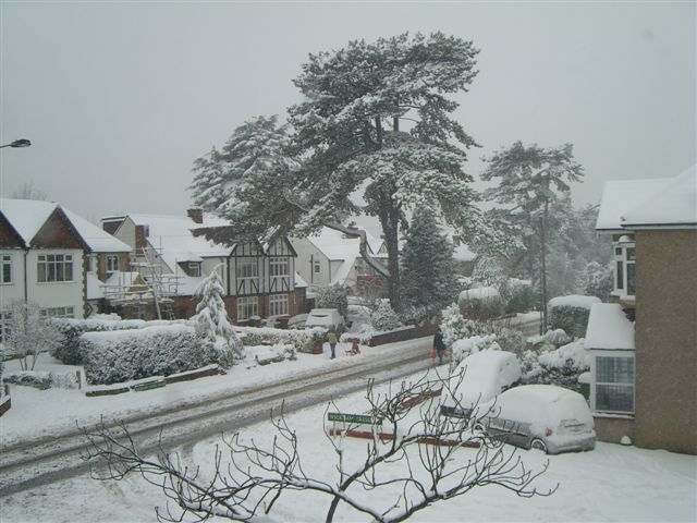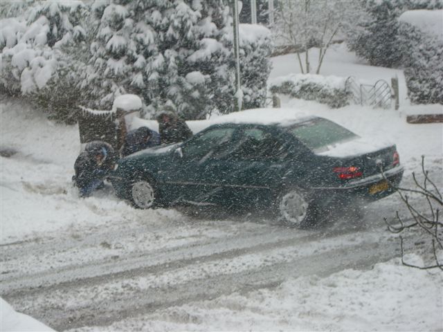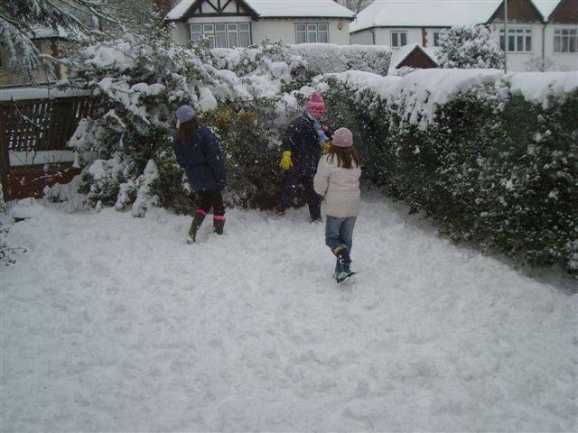 Here we have had the worst snowfall in London for 18 years. I didn't get to work today. As soon as I looked out of the window this morning, I realised there were no cars in the road outside our house except one in the process of getting stuck. Even if I had been able to move on the main road, I couldn't have got out of the side road where I park onto the main road, and I would have had the same problem the other end if I got to work. I thought of going by bus, then I heard they were all cancelled, likewise the trains. So I set out to walk, which would be three hours on a good day; I did about two miles in 45 minutes and was mighty relieved when my manager called me and said she had spoken to her manager and they were going to close the place for the day. Fortunately my branch of the NHS doesn't normally deal with life-threatening situations; I don't know what I would have done if I had been an ambulance driver or worked in an operating theatre. So I was back home by 10.15 and of course all the schools were closed so the girls had a great day. I took these photos. SL700791 is the snowman they built in our back garden ' 795 is our girls plus a friend having a snowball fight in the front garden. ' 796 is Alice with a snowball clearly enjoying herself; fortunately I was indoors the other side of the window. ' 798 is the view of our road from our bedroom window; quite pretty if you didn't have to get anywhere important. ' 801 is the bloke across the road having to be pushed when he got his car stuck trying to get into his drive, which illustrates the problems I would have faced if I had tried to get out of the side road to the right of our house, and to go anywhere where the snow was not well flattened by previous traffic. I don't know what I will do tomorrow; they say the snowfall will move north, but what is on the ground here will freeze overnight and make for very treacherous conditions in the morning. Adrian