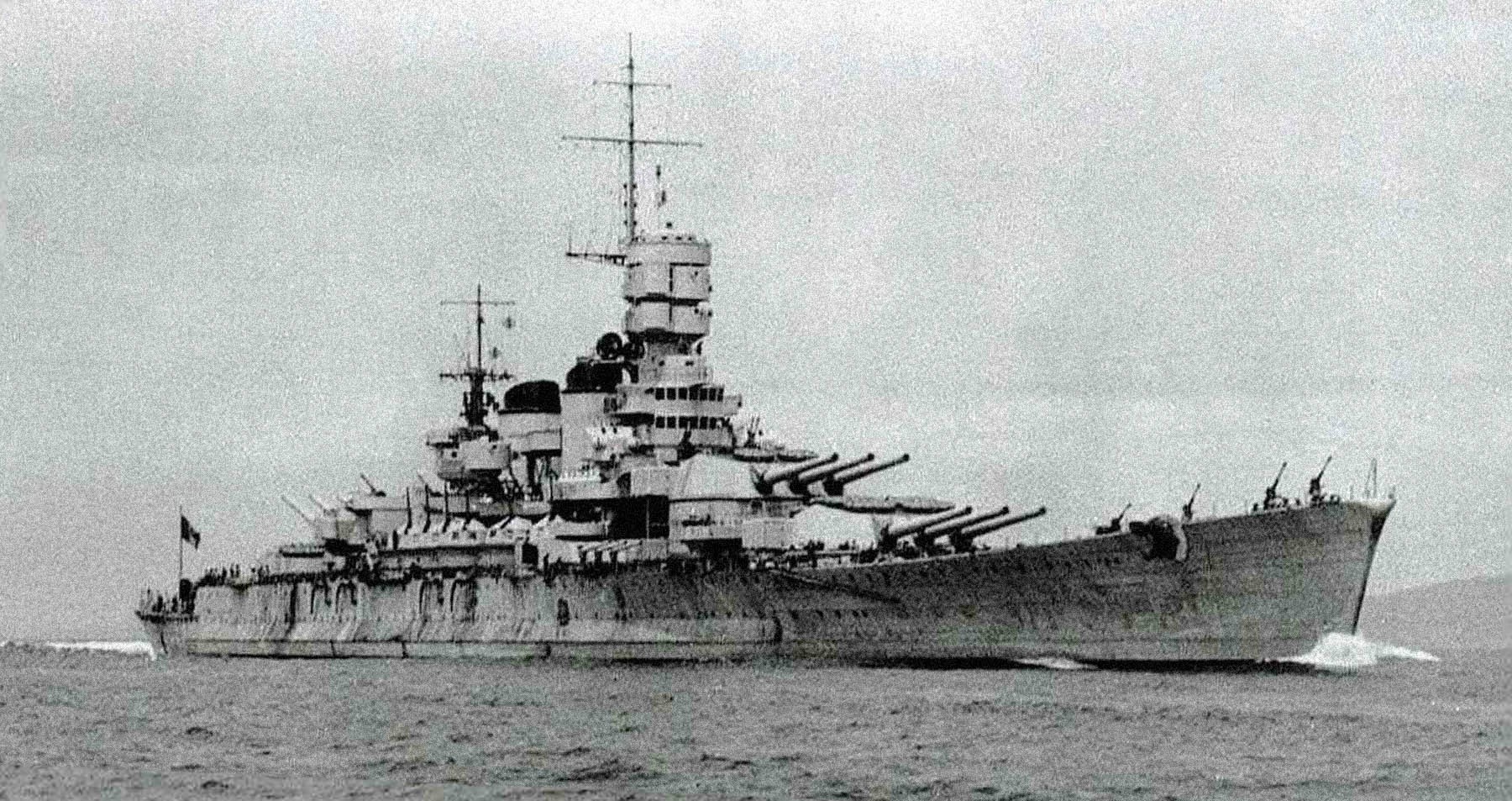 King Victor Emanuel III approved and signed an Armistice between Italy and Allied armed forces in 3rd Sep'43.So the Italian fleet was sailing to Malta to surrender,instead of attacking Allieds' approaching Salerno. This enraged Axis. On 9th,Luftwaffe's Kampfgeschwader[Kg] 100 armed with their first[in military history] precision guided missiles,attacked RN Roma. Its superstructure easily caught in sight at the Strait of Bonifacio.Now eleven Dornier Do 217 bombers who were on vigilance of the Strait,released two SD-1400Fx ordinances towards Roma. Though RN Roma was heavily armourd and strong enough to withstand depth charges/torpedoes etc..still two massive blows sank her.The first bomb went through[amidships] and exploded nearby keel;second one at turret B,and as magazine of B turret detonated,simply blew it off and foundered at sea bed. About 1500[not sure]on board along with Admiral Bergamini unable to survive[9th Sep'43].
