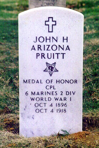 Birth - Oct. 4, 1896 Death - Oct. 3, 1918 Cpl Pruitt is one of only five Americans to be a recipient of the Double Medal Of Honor. A Double Medal Of Honor was given by both the United States Army and the United States Navy for the same act. Cpl Pruitt was killed in that action on October 3,1918. His official Army CMOH citation reads as follows - Corporal Pruitt single-handed attacked 2 machineguns, capturing them and killing 2 of the enemy. He then captured 40 prisoners in a dugout nearby. This gallant soldier was killed soon afterward by shellfire while he was sniping at the enemy. His official Navy CMOH citation reads as follows - For extraordinary gallantry and intrepidity above and beyond the call of duty while serving with the 78th Company, 6th Regiment, 2d Division, in action with the enemy at Blanc Mont Ridge, France, 3 October 1918. Corporal Pruitt, single-handed attacked 2 machineguns, capturing them and killing 2 of the enemy. He then captured 40 prisoners in a dugout nearby. This gallant soldier was killed soon afterward by shellfire while he was sniping the enemy. Arlington National Cemetery Arlington Virginia, USA Plot - Section 18, Lot #245-3, Map Grid P 10