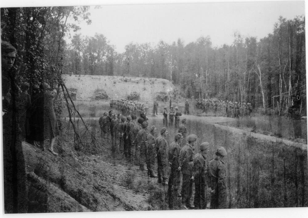 Just a little way away in the woods around "Kamp Vught" is the Killing Place. The camp was not a extermination camp ( no gas chambers) but terrible cruelties were perpetrated there. Mostly those that were executed were shot at the Killing Place. The Butts (sand bank) in b&w photo from 1944, is approximately where the memorial wall (2004) is now. In front of that wall of names is the original trench in front of the Butts with wooden posts still in evidence.