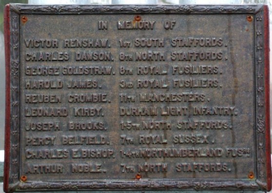 This memorial can be found beside the main road from Leek to Cheddleton And opposite to where Joshua Wardle had a factory This memorial was erected by Joshua Wardle to the memory of the men who worked for him and who fell in the Great War BELFIELD Percy, Pte G/15156, 7th Royal Sussex Regiment killed in action 13 August 1918. Son of George and Mary Ellen of 20 Union Street and husband of Lizzie of 24 Union Street, Leek. Buried at Beacon Cemetery, Sailly-Lauriette, France BISHOP Charles, Pte 201344, 1/4th Northumberland Fusiliers died 26 March 1918. Native of Leeds and residing in Leekbrook. Commemorated on the Pozieres Memorial, France BROOKES Joseph Pte 201584, Prince of Wales 1/5 North Staffordshire Regiment killed in action 14 March 1917 age 29. Son of Thomas and Sarah Ann of 63 London Street, Leek Commemorated on the Thiepval Memorial, France CROMBIE Reuben, Pte 24158, 11th Manchester Regiment killed in action 26 September 1916 age 35. Son of Reuben and Mary Jane of 20 Crosshill Street, Leek and husband of Bertha Brown formerly Crombie of 14 Station Road, Milton, Stoke on Trent, Staffs. Buried at Regina Trench Cemetery, Grandcourt, France DAWSON Charles Rowland, Pte 30005, Prince of Wales 8th North Staffordshire Regiment died of wounds 30 November 1916 age 25. Born at Rainhill near Prescot Lancs and residing at Cheddleton near Leekbrook with his wife Emma, nee Gilbert and son of Andrew and Edna of the Flint Mill, Cheddleton. Father a native of Cheddleton. Buried at Terlincthun British Cemetery, Wimille, France GOLDSTRAW George, Pte 12391 8th Royal Fusiliers City of London Regiment killed in action on the 7 July 1916 aged 19. Born at Wetley Rocks, near Cheddleton, enlisted at Cheddleton and residing with his parents Samuel Cooper and Jane Goldstraw at Basford Bridge, Cheddleton. Commemorated on the Thiepval Memorial, France KIRBY Leonard, Pte 196392, 77th Labour Corps, formerly Pte 39961 North Staffordshire Regiment died 10 September 1917 in England. Son of Mary, widow, of 82 Mill Street, Leek. Buried in Leek Cemetery. This memorial have him serving in the Durham Light Infantry. The only Kirby found was a George Leonard, Pte 23087, Durham Light Infantry, in the Medal Rolls, and not found to have died NOBLE Arthur, Pte 16818, Prince of Wales, 7th North Staffordshire Regiment, Died of wounds 27 January 1917. Son of William and Mary A of 43 London Street, Leek. Buried at Amara War Cemetery, Iraq. Native of Leek RENSHAW Victor, Pte 43011, 1st South Staffordshire Regiment, formerly 17559 North Staffordshire Regiment killed in action 4 October 1917 Enlisted at Leekbrook and living with his parents Samuel & Annie at 4 Talbot Street, Leek. Commemorated on the Tyne Cot Memorial, Belgium