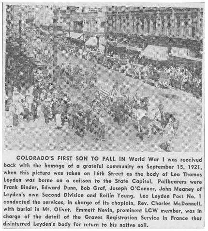 Leo Thomas Leyden, the first Denver man to be killed in action, was born in Denver and lived here most of his life. He was educated in the public schools and in the Denver University. He enlisted in the Marine Corps on July 1, 1917 and took his training at Mare Island, California. He was transferred to Quautico, Virginia in November, 1917. He was assigned to the 17th Company, 5th Regiment, U.S.M.C. On December 27th he had his first experience with the Hun, when an attempt was made to torpedo the ship, but instead, the sub was destroyed. It was the same day that he arrived in France. He saw action near Verdun early in the spring of 1918 where he was gassed. At the height of the German drive on Paris he was sent to the Chateau-Thierry Sector, where he helped repulse the German drive on Paris. Robert Graf, one of the members of this Post was in the same Company with Leo. On June 6th, Bob was lying in an advanced, exposed position, seriously wounded. Leyden, a runner for the platoon, came across Graf and, without regard for himself threw his wounded Denver buddy over his shoulder and carried him over 500 yards through a heavy shell fire, to a dressing station. On the morning of June 15th Leo was in a dugout, awaiting orders to go on outpost duty when a large shell made a direct hit on the dugout, killing him. He was buried near Lucy and later his body was returned to Denver, where his remains were intered in Mount Olivet Cemetery.