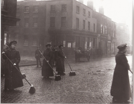 WWI is under way here in 1916 so the ladies left at home are doing their part as road sweepers !!