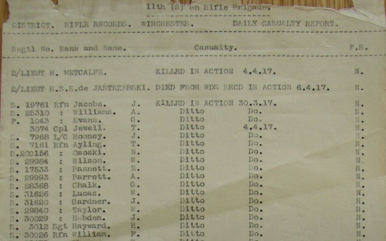 Hi Annie, He was 11th RB's. Lots of errors in the CWGC with battalions the men died with but in this instance they are right. Attached is one of the 11th RB's casualty lists forApril 1917. Andy