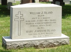 Major William J. Bland - Apr. 20 1887 - Sep. 12 1918 Burial - Arlington National Cemetery Arlington Arlington County Virginia, USA Plot - Section 1 Site 412 Major Blands name is included with the Kansas Citians who died in World War One .... his name is on the wall in bronze in Memory Hall, The Liberty Memorial. http://www.flickr.com/photos/chrism70/45672578/ William J. Bland was born in Weston, West Virginia. He moved with his parents to Washington D.C. in 1900. He was educated there and was admitted to the bar. He moved to Kansas City to take a position as assistant city solicitor. After volunteering, he became a captain of infantry with Company A, 356th Infantry, 89th Division. In September 1918, he was promoted to major in command of the 1st Battalion. Major Bland was killed in action on September 12, 1918, just at the beginning of the St. Mihiel offensive. One description of that morning in a history of the 356th related that “for miles the sky was lighted up by the exploding shells and the flash of the guns and it was a wonderful and terrible sight. With ever increasing fury the barrage lasted until 5:30 a.m. when it lifted and the boys went over the top, full of confidence that nothing could stop them. It was near Euvezin, France that a death occurred which cast gloom over the First Battalion. Major William J. Bland, formerly Captain of Company A, was killed instantly by a piece of shrapnel. Major Bland was an excellent officer and a noble man one who was sorely missed in later operations.” “September 18, 1918. This is the seventh day of the St. Mihiel drive and I find myself sitting in a thick muddy forest, with my knees and a gas mask as a table writing to you. It was some drive. Small, in comparison to many operations, to we rookies it was a real battle. Machine guns, rifles, shells, aeroplanes and tanks - everything you read about .... Sgt. Charles S. Stevenson, Co. A, 314th Engineers, 89th Division. Major Bland’s body was returned to Arlington National Cemetery for burial
