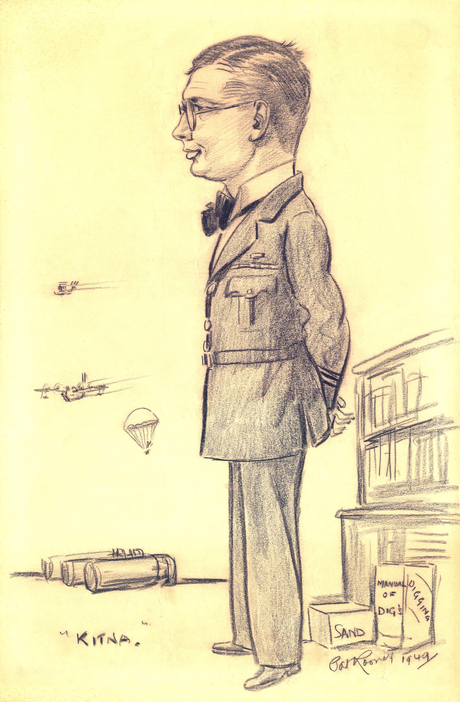 Pat Rooney caricatures - a late addition to an old thread My father-in-law (Flt Lt John Leonard [Jack] 'Kitna' Price) was a munitions and supply officer during the war and for several years afterwards. He served at a number of airfields, so I've no idea where he was in 1949 when Pat Rooney sketched the attached image. According to his wife Mary (now aged 94 and living quite independently in Stone, Staffordshire), 'Kitna' was Urdu, Hindi or some such for 'How many/much ?'. Most appropriate, I'm sure, for a supply officer ! I hope he wouldn't mind my borrowing his moniker. Rooney also sketched Mary at the same time but, sadly, the sketch has been misplaced over the years. Shame - apparently she was shown pushing a pram laden with books (she and Jack had seven children and both parents were inveterate bookworms). The sketch also showed Mary, somewhat incongruously, waving a tennis racquet in one hand; for her, tennis was another favoured activity at the time. I hope you find the image to be yet another intriguing addition to the Rooney catalogue. Jack's daughter (my wife) and I have enjoyed looking at the others in this thread. Kitna1