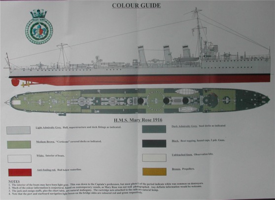 Hi Joe, here is a model made by a gentleman of the HMS Mary Rose (1915) , Name : HMS Mary Rose Laid Down : 17th November 1914 Launched : 8th October 1915 Completed : March 1916 Type : Destroyer Class : M Builder : Swan Hunter Country : UK Pennants : Fate : Sunk 17th October 1917 HMS Mary Rose did not survive the war to meet this ignominious fate. Launched October 8, 1915, HMS Mary Rose joined the Grand Fleet in 1916 and took part in the Battle of Jutland. In October 1917 Mary Rose, along with HMS Strongbow, were assigned to escort a convoy to Scandinavia. At dawn of October 17, 1917, the convoy was spotted and attacked by two Imperial German light cruisers/ minelayers, SMS Brummer and SMS Bremse. In keeping with the highest traditions of the Royal Navy and the destroyer force in particular, both escorting destroyers charged their greatly superior opponents in an attempt to allow the convoy to escape. Strongbow was hit and disabled by the first salvo from the cruisers and sank three hours later. Mary Rose continued to press in against the two cruisers in an attempt to torpedo them. The odds were hopeless and the German gunnery too accurate. Before she could reach torpedo-firing range, she was sunk by the German cruisers. With no further opposition, the cruisers massacred the convoy, sinking nine of the twelve merchant ships. (History of the class and the Mary Rose is from the WEM instructions and British Destroyer 1892-1953, by Edgar March.) regards Keith i have an idea have you got in contact with Greenwich maritime they have the blue prints for most ships and will have the pennant of the HMS Mary rose , I will keep looking