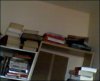 I tried two different Argos shops and you have t order them from the website! So, I will have to be around to have them delivered! In addition, my washer dryer went kaput on me yesterday! I know how to fix it, its very simple just replace the program control module, but cant get the spare parts! S, will have to get a new one and in the meantime will have to use the laundrymat about a mile and half away! Better still, I got a phone call from my supplier of lucky white heather, due t a fire at his warehouse, he cant delivery any! Even worse I cant find my enchanted monkeys paw! But here is a photo of the damage to the bookcases! I had to use my webcam.