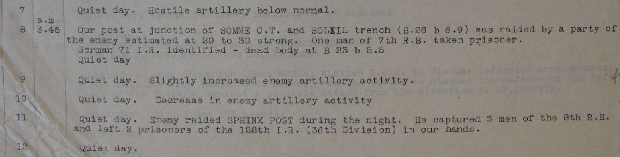 The 128th I.R. was from the Gdansk area and we are fortunate that their Regimental record of this action survives and ties in pretty accurately with the 8th R.B.'s account apart from the German account states that they bombed out on of the dug-outs that contained 12 men.