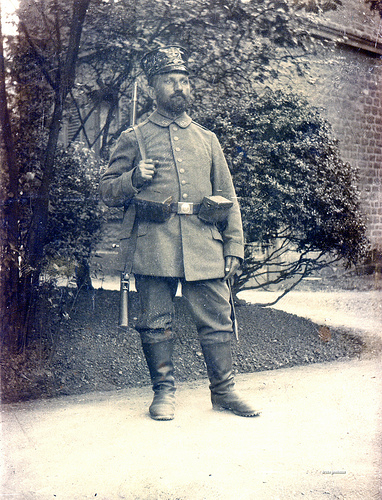 I found some WW1 soldier photos from Germany and France .... thought they maybe of interest ! If anybody would like to add anything ... please do ! We were looking for uniform pictures for another thread .... this soldier has a wonderful beard !! Simply "Bruno" on reverse. Landsturmmann wearing usual M1913 Wachstuchmutze, M1907/10 (or 1913) feldrock with metallic "63" device on the collar (brigade number). The presence of these numbers on the uniform dates this picture pre: 14 April 1915, after this date it was ordered (AKO - Allerhochste Kabinettsorder) they be removed and replaced with Armeekorps and Bataillon numbers. His ammunition pouches are the M1895 type, each capable of holding 45 cartridges and he is armed with a Gew 88 and S71 bayonet. http://www.flickr.com/photos/29007475@N08/4011108860/in/pool-greatwar