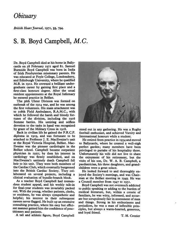 This is one of a series of posts to mark the international Rugby players who served in, and survived, The Great War. If anyone has further information on the men concerned, I’d be most grateful if it could be added to the thread. Gareth Campbell, Samuel Burnside Boyd played for Ireland Internationals: 12 : 1911 E+ S+ W- F+ ; 1912 F+ E- S+ W+ SA- ; 1913 E- S- F+ Samuel Campbell was born on 29 June 1899 Played as a Forward for: Foyle College, Edinburgh University, Derry Profession: Medicine War service: Lieutenant, Royal Army Medical Corps from 16 December 1914. As a Temporary Captain, he relinquished his commission on 16 December 1918 and was granted the rank of Major. He died on 1 March 1971
