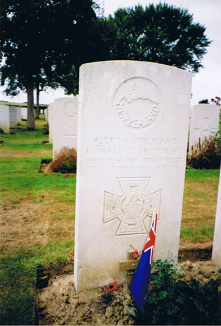 In Memory of Serjeant DONALD FORRESTER BROWN V C 8/3504, 2nd Bn., Otago Regiment, N.Z.E.F. who died age 26 on 01 October 1916 Son of Robert and Jessie Brown, of Wharf St., Oamaru, New Zealand. Native of Dunedin. Remembered with honour WARLENCOURT BRITISH CEMETERY Grave in Warlencourt British Cemetery of Sergeant Donald Forrester Brown VC. New Zealand Otago Regiment, N.Z.E.F. Killed in action 1st October 1916 aged 26 years. An extract from the London Gazette records; “For most conspicuous bravery and determination in attack (south-east of High Wood, France on September 15, 1916) when the company to which he belonged had suffered very heavy casualties in officers and men from machine gun fire. At great personal risk this N.C.O.advanced with a comrade and succeeded in reaching a point within 30 yards of the enemy guns. Four of the gun crew were killed and the gun captured. The advance of the company was continued until it was again held up by machine-gun fire. Again Sergeant Brown and his comrade, with great gallantry, rushed the gun and killed the crew. After this second position had been won, the company came under very heavy shell fire, and the utter contempt for danger and coolness under fire of this N.C.O. did much to keep up the spirit of his men. On a subsequent occasion in attack Sergeant Brown showed most conspicuous gallantry. He attacked, single handed, a machine-gun which was holding up the attack, killed the gun crew, and captured the gun. Later, while sniping the retreating enemy, this very gallant soldier was killed.” Son of Robert and Jessie Brown of Wharf Street, Oamaru, New Zealand. Native of Dunedin.