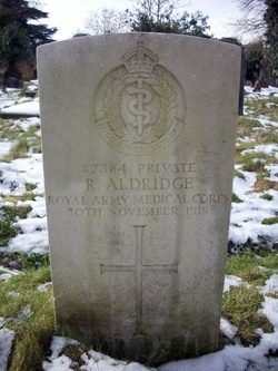 Pvt 87384 Robert Aldridge was serving with 35 Company (Milbank) R.A.M.C. He was 38 years old .... he is buried Reading Cemetery (Wokingham Road). In Memory of Private ROBERT ALDRIDGE 87384, 35th Coy. (Millbank), Royal Army Medical Corps who died age 38 on 30 November 1918 Husband of Matilda Aldridge of 2 Sherman Place, Sherman Road, Reading. Remembered with honour READING CEMETERY