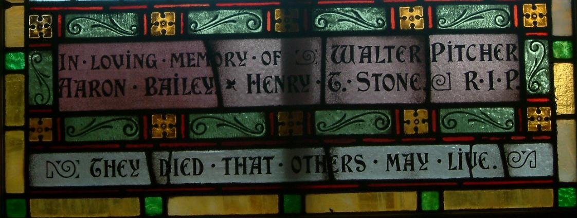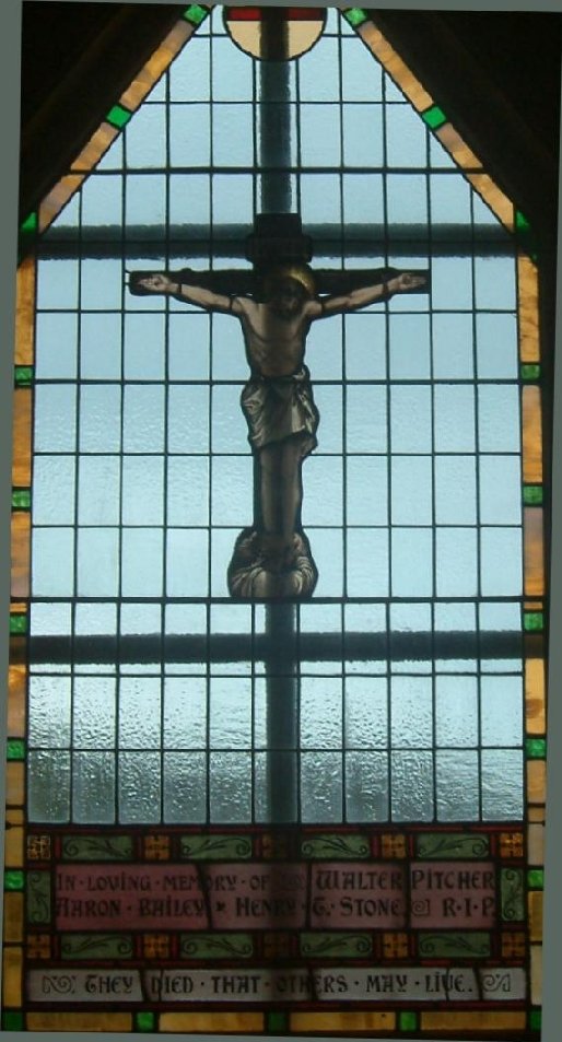 St. Luke's Anglican Church in Old Bonaventure has a stained glass window in its chancel above the altar with Jesus on the crucifixion cross, the window is in memory of three men from the community that lost their lives in the First World War: Aaron Miller Bailey, Walter Kenneth Pitcher and Henry Thomas Stone. Pte. Aaron Miller Bailey was born on May 23, 1894 in Whale Cove, Old Bonaventure to George Garrett and Martha Mary (Miller) Bailey. He served in the 25th Battalion of the Canadian Expeditionary Force and died on April 27, 1916. He had three brothers who also served in the First World War: Bingley Garland Bailey in the Royal Navy, Garrett Cecil Bailey in the Forestry Corps and William Bailey. Sergeant Walter Kenneth Pitcher was born in Old Bonaventure on April 6, 1891 to Archibald James and Fanny Elizabeth Pitcher. He served in the Royal Newfoundland Regiment, service number 2115 and was awarded the Military Cross. He died on November 20, 1917. Pte. Henry Thomas Stone was born in Old Bonaventure on June 18, 1891 to Levi and Sarah Stone. He served in the Royal Newfoundland Regiment, service number 2099. He died on April 14, 1917 at Monchy, France. (Source: The Fighting Newfoundlander by Colonel Nicholson) http://www.virtualmuseum.ca/pm.php?id=story_line&lg=English&fl=&ex=00000106&sl=1633&pos=1