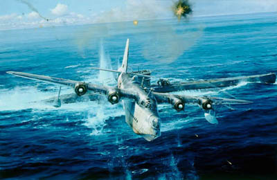 The date is July 30, 1943; the scene is the Bay of Biscay, that expanse of sea between the Brest Peninsula and the north coast of Spain, where the German U-boats were at their most vulnerable as they set out and returned from their deadly missions in the Atlantic Ocean. Three German U-boats, heading for the Wolf Packs with fuel, ammunition and supplies, have been caught on the surface by aircraft from RAF Coastal Command and, under instructions from Admiral Donitz, the submarines will remain on the surface and fight. Circling in a defensive pattern, each of the three submarines could bring to bear 10 guns to welcome an intruder, together providing an intense wall of firepower comprising no fewer than 30 cannons plus machine guns. The effective use of depth charges demanded an attack from an extremely low level, and the dangers to the aircrews were therefore intense. A predominantly Australian crewed Sunderland prefix U from No. 461 Squadron RAAF arrived on the scene. Its pilot, Flight Lieutenant Dudley Marrows, having assessed the situation, immediately heads into the attack. Bringing his massive flying boat, identification letter U, down to wave top height, he makes a daring run at the nearest U-boat. By a strange quirk of fate, his chosen target is U-461, a type XIV tanker. The final moments of U-461 came as Marrows powers his four-engine aircraft over the conning tower, through a hail of gunfire from all three submarines. Seven depth charges straddled U-461 and the explosions literally blew the ship apart. Climbing away to assess the situation Dudley Marrows could see survivors in the water and in an involuntary act of compassion, flew back over the scene to drop one of his three dinghies to the survivors. It saved their lives. Aided by; a Liberator of 53 Sqn. RAF, a Sunderland of 228 Sqn., a Catalina of 210 Sqn., together with Captain Walker's Royal Navy destroyers in the final action, the Allies air and surface forces accounted for the two remaining submarines, thus wiping out an entire U-boat group. "The U-boats were maneuvering in formation, keeping bows pointed towards the attacking aircraft, putting up a formidable barrage of cannon and machine gun fire. I decided the only thing to do was to go in as low as possible. We went in, jinking violently, with all 30 guns of three submarines firing at us. Shrapnel was hitting the fuselage like hail. Just skimming the swell tops, I had to pull up to clear the sub as I dropped my depth charges. We just cleared the conning tower." Sunderland pilot, Flight Lieutenant Dudley Marrows RAAF