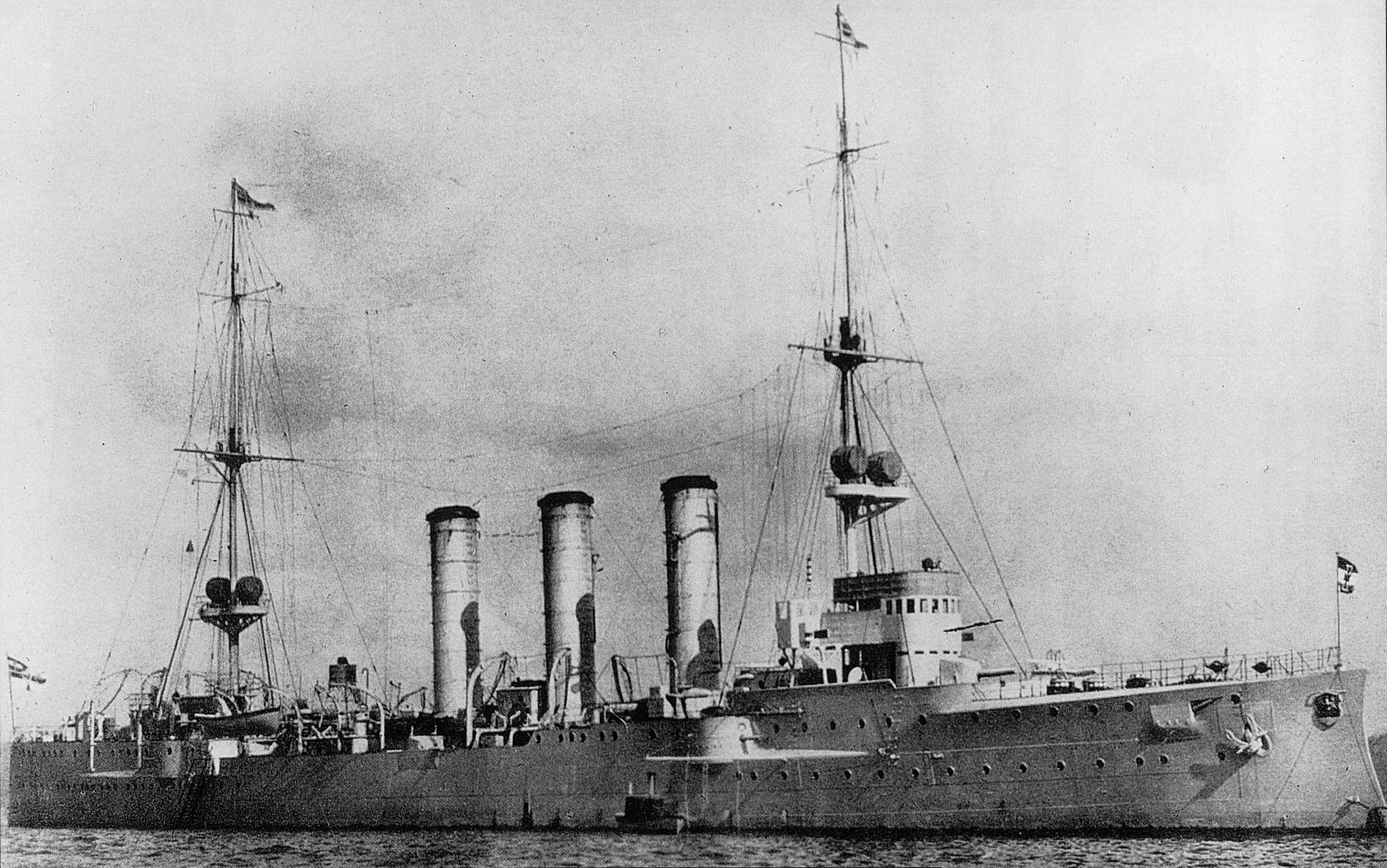 The German cruiser Emden and the French destroyer Mousequet and the Russian cruiser Zhemchug which she sank...