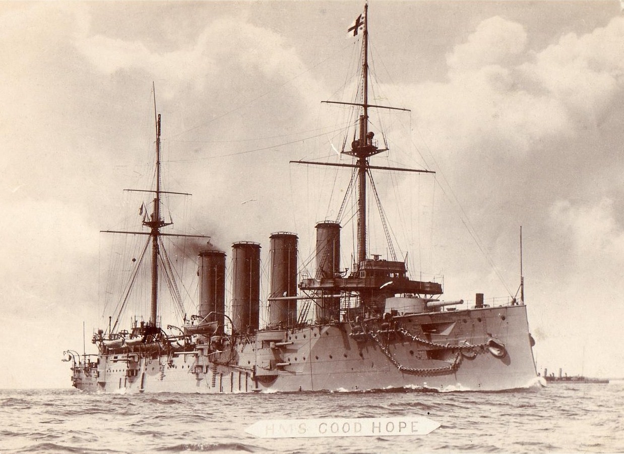 'HMS Good Hope''' ................ was a 14,100-ton Drake-class armoured cruiser of the Royal Navy - she was originally planned to be named "Africa'', but was renamed before she was launched. Laid down on 11 September 1899 and launched on 21 February 1901, with her heaviest gun being of 9.2 inch (234mm) calibre, she became the flagship of the 1st Cruiser Squadron, Atlantic Fleet, in 1906, and in 1908 became the flagship of the 2nd Cruiser Squadron. She went into the Reserve Fleet in 1913, but following the mobilisation just before the outbreak of the First World War, she joined the 6th Cruiser Squadron. The 6th Cruiser Squadron was initially allocated to the Grand Fleet at Scapa Flow to replace the 4th Cruiser Squadron (of Monmouth class cruisers) which had previously been sent to Rear-Admiral Sir Christopher Craddock's North America and West Indies command to help protect British interests during the Mexican Revolution. However, the Admiralty almost immediately (mistakenly) concluded that it was likely that German liners in New York and other ports on the United States Atlantic seaboard could convert themselves to armed merchant cruisers by installing guns which the Admiralty believed they carried in their holds. They therefore diverted Good Hope to further reinforce Craddock's force, and she left Portsmouth on 2 August 1914 under the command of Captain Philip Francklin. Craddock transferred his flag to her on her arrival at Halifax, Nova Scotia because, although 90% of her crew were reservists who had been given little opportunity to train together in the ship, she was faster than his current flagship HMS Suffolk. For the next few weeks she was employed protecting British merchant shipping as far south as Pernambuco and later the Falkland Islands. She then embarked on the search for the German East Asiatic Squadron, leaving Stanley on 22 October for the west coast of South America via Cape Horn. She was sunk ...... along with HMS Monmouth - by the German armoured cruisers Scharnhorst and Gneisenau under Admiral Graf Maximilian von Spee ........ with the loss of her entire complement of 900 hands in the Battle of Coronel on 1 November 1914 off the Chilean coast Here's some photos of her crew !! http://www.coronel.org.uk/crew_g.php