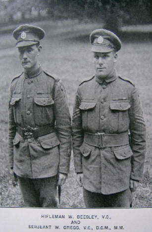 William Gregg 1890-1969) was born at Tag Hill, Heanor, and joined the 13th Battalion of the Rifle Brigade in 1915. He was the first British Soldier ever to receive the 3 highest awards for gallantry. He received the Military Medal on 26 March 1917, for crawling between the opposing lines under the eyes of the enemy to establish the identity of a dead German soldier. On 26 November 1917, for carrying messages between different sections of his battalion while under heavy machine gun fire, he received the Distinguished Conduct Medal. Finally, on 28 June 1918, for "most conspicuous bravery and brilliant leadership in action," taking a German machine gun post after twice being forced back, he was awarded the Victoria Cross. The photograph shows him receiving the VC from King George V at the British Army headquarters at Doullens in France. After returning to England, he went back to work as a miner, until retiring in 1959. Sergeant Gregg died in 1969, and received full military honours at his funeral at the Heanor Free Church on Midland Road, prior to cremation at Markeaton. The Times newspaper ran an obituary for Mr Gregg, which perhaps goes some way to show how significant an achievement his was. He is remembered not only by a street name, but in the name of the town's Leisure Centre, opened in 1970. William Gregg, was born in Heanor on January 27, 1890. His father worked in the hosiery trade. Young Bill attended Mundy Street School in the town before becoming a miner at Shipley Colliery. At the age of 20, the young man wed his sweetheart, Sarah, but, after just four years of married life, the First World War broke out. Gregg soon enlisted in the Rifle Brigade and, by May 1915, he was with the 13th Battalion in France. Serving with the same unit was fellow Derbyshire man William Beesley. Over the next four years, both he and William Gregg endured the horrors of trench warfare on the Western Front in France. http://freepages.genealogy.rootsweb.ancestry.com/~militaryimages/bilgregg.htm http://bygonederbyshire.co.uk/articles/WWI:_Pitmen_who_won_VC_in_same_battle