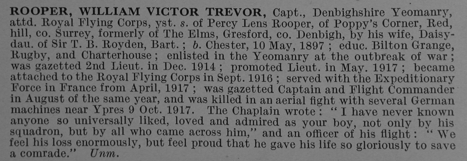 In Memory of Captain WILLIAM VICTOR TREVOR ROOPER Royal Flying Corps and 24th (Denbighshire Yeomanry) Bn., Royal Welsh Fusiliers who died age 20 on 09 October 1917 Born at Chester. Son of Percy L. and Alice Nancy Rooper, of Little Court, Speldhurst, Kent. Remembered with honour BAILLEUL COMMUNAL CEMETERY EXTENSION (NORD) After service with the Denbigh Yeomanry Lieutenant Rooper who was born in 1897 joined 1 Squadron in early summer 1917 and first claimed on 28 July. In mid september he was promoted to flight commander and by early November had brought his score to eight. Rooper is often reported killed in action on 9 October that year but he was actually shot down and crashed in the front line trenches breaking his thigh whilst flying B6767 near Polygon Wood. He subsequently died . Captain William Victor Trevor Rooper Croix de Guerre (Belgium) from Gresford, Denbighshire and formerly with the 24th Bn RWF, was flying Nieuport 27 B6767 of No 1 Sqn RFC when he was killed in action on 9 October 1917. Capt Rooper was in combat with enemy aircraft over Polygon Wood when he was brought down; his aircraft crashed in the Front Line trenches and Capt Rooper was fatally injured. They say he was shot down by Ltn Xaver Dannhuber of Jasta 26 ( his 7th victory ! ) on October 9th 1917 ..... http://books.google.com/books?id=K5...=0CBoQ6AEwAw#v=onepage&q=w v t rooper&f=false Previously wounded ... now reported killed http://74.125.113.132/search?q=cach...rooper&cd=6&hl=en&ct=clnk&gl=us&client=safari Remembered GODALMING, CHARTERHOUSE SCHOOL MEMORIAL CHAPEL http://www.roll-of-honour.com/Surrey/GodalmingCharthouseSchool.html