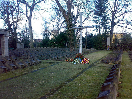 My friend Mike took this picture and found these graves .... I find the Cross very poignant don't you ? Martin BARTKOWIAK gefreiter */11/1891 - 25/04/1918 ==================== Adolf CHERNOHOWSKY landsturmmann 30/10/1874 - 07/10/1917 ==================== Stanislaus CHLEBOWSKI gefreiter 19/12/1890 - 03/08/1915 ==================== Johannes DICKERT flieger 16/10/1899 - 27/11/1917 =================== Softa DOMENICO ital. soldat --- - 10/07/1918 =================== August MAJEWSKI landsturmmann 06/08/1873 - 29/04/1917 =================== Otto RECH landsturmmann 02/08/1871 - 21/03/1917 =================== Friedrich SEEBER wehrmann 06/09/1884 - 18/11/1914 =================== Heinrich SOYK pionier 23/02/1894 - 03/04/1917 =================== Johanness SZCZEPANSKI gefreiter 14/01/183 - 16/09/1918 =================== Adam SZYMANSKI musiker 21/12/1898 - 14/05/1918 =================== Georg VONHOF pionier 07/06/1881 - 26/01/1918 =================== Stanislaus WESELOWSKI musketier 30/04/1892 - 07/08/1918